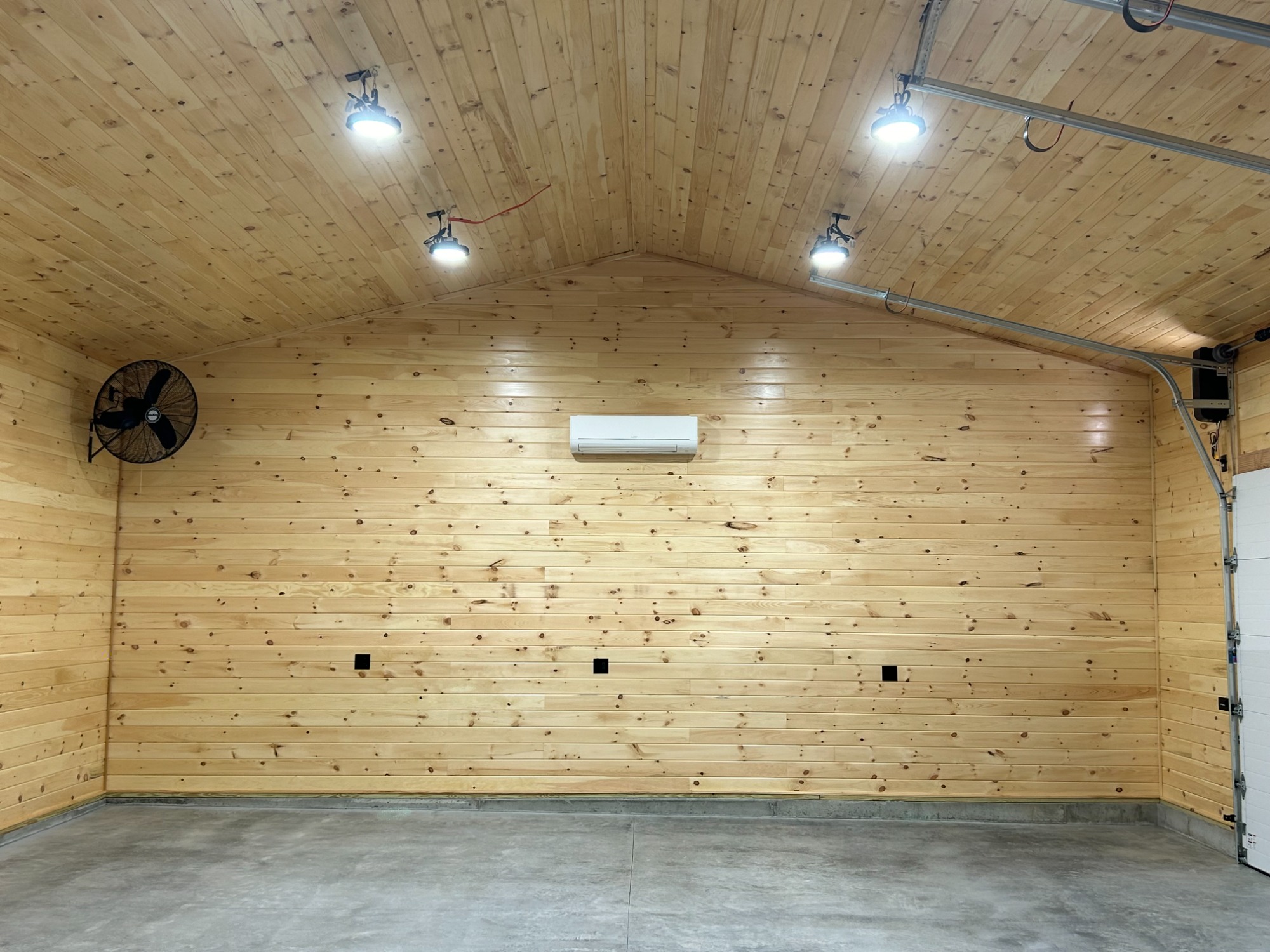 New foundation and slab on grade, custom log siding, HVAC system, full insulation. V-groove pine interior walls and ceiling, oversized garage doors, custom lighting and security systems. New three season room addition.